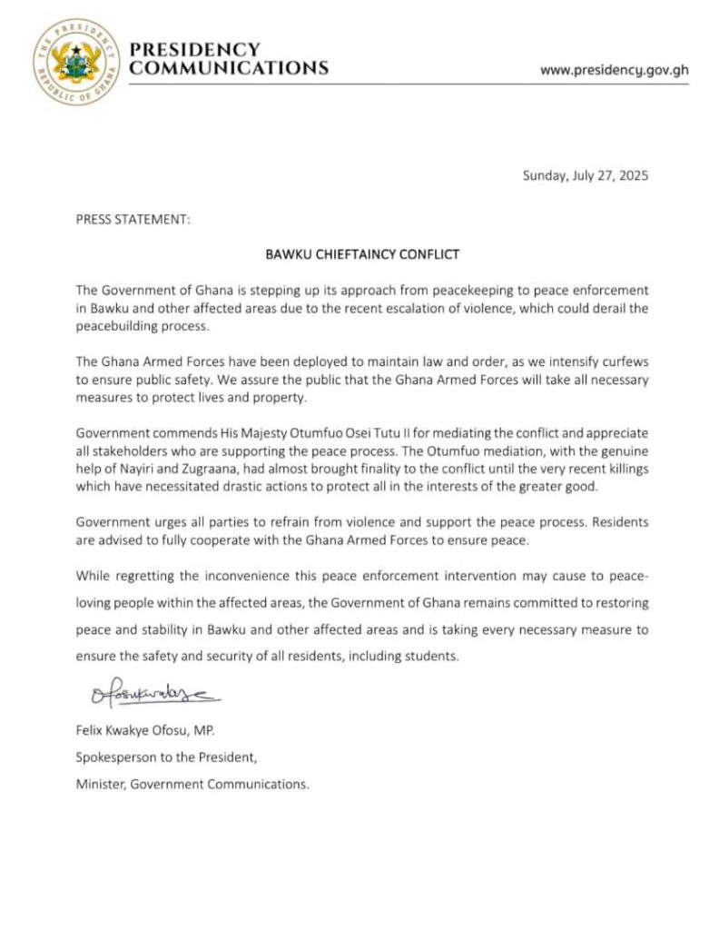 While the presidency acknowledged the potential discomfort this military operation may cause to peace-loving residents, including students, it stressed that the move is crucial for long-term stability. The government reaffirmed its commitment to restoring peace in Bawku and other affected areas, pledging firm and fair enforcement to ensure security for all.
