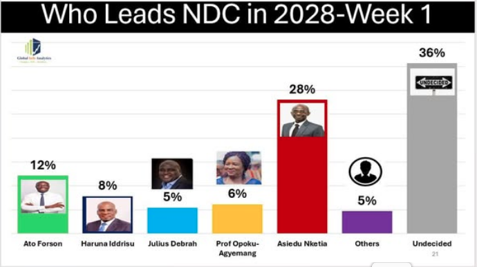 A new poll by Global InfoAnalytics shows a tightening race among potential contenders for the flagbearer slot of the National Democratic Congress (NDC) ahead of the 2028 elections.